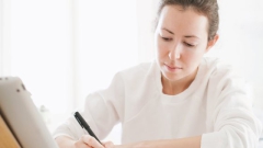 • Industrial Engineering Schmuckbild zeigt modernes Tablet, welches industrielle Roboterarme steuert.