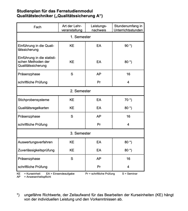 Der Fernstudienkurs Qualitätstechniker/-in erstreckt sich einschließlich der schriftlichen Prüfungen über einen Zeitraum von 3 Semestern (Regelstudienzeit).